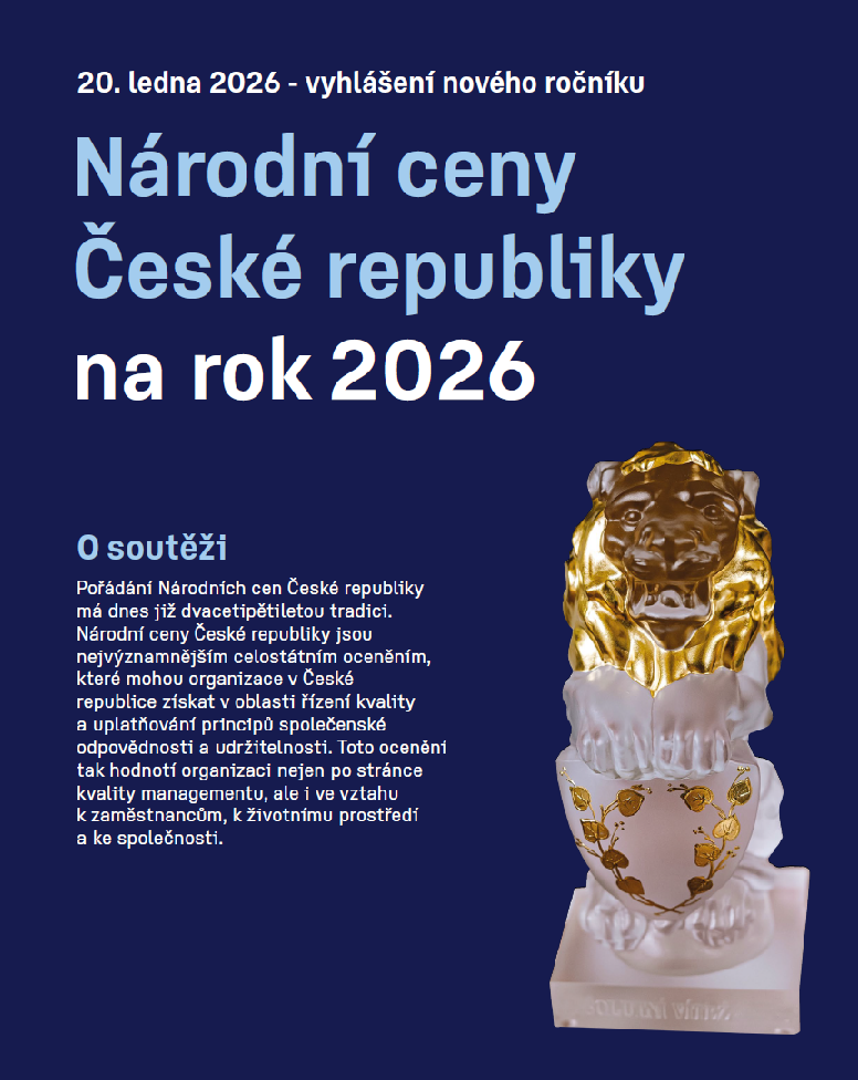 Otevíráme 26. ročník Národních cen České republiky! Tato prestižní ocenění se každoročně udělují organizacím, které se systematicky a dlouhodobě zaměřují na kvalitu, odpovědnost a udržitelnost ve své práci.